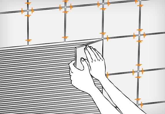 • Хорошо прижмите плитку резиновым молотком обеспечить полный переход плиточного клея с подложки и плитки.