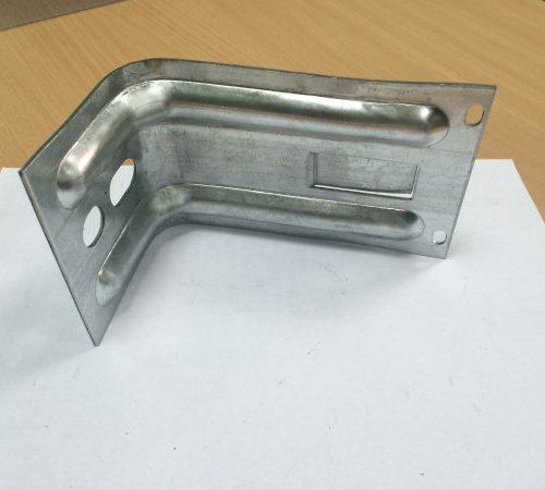 Кронштейн представляет собой анкерный уголок, толщиной 2 мм (бывают 1,2 мм.) с двумя ребрами жесткости и отверстием под анкерный крепитель. Производятся из стального тонколистового, холоднокатанного, горячекатанного проката с защитным цинковым покрытием, с дополнительным полимерно-порошковым покрытием.