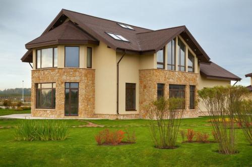 В данном случае использовался именно такой материал в сочетании с оранжевой крышей. Композиция, созданная дизайнерами, выглядит уютно. Белая кайма по углам дома делает общую картину завершенной. Экстерьер этого типа великолепно дополняется каменным фундаментом и застекленным входом в здание.