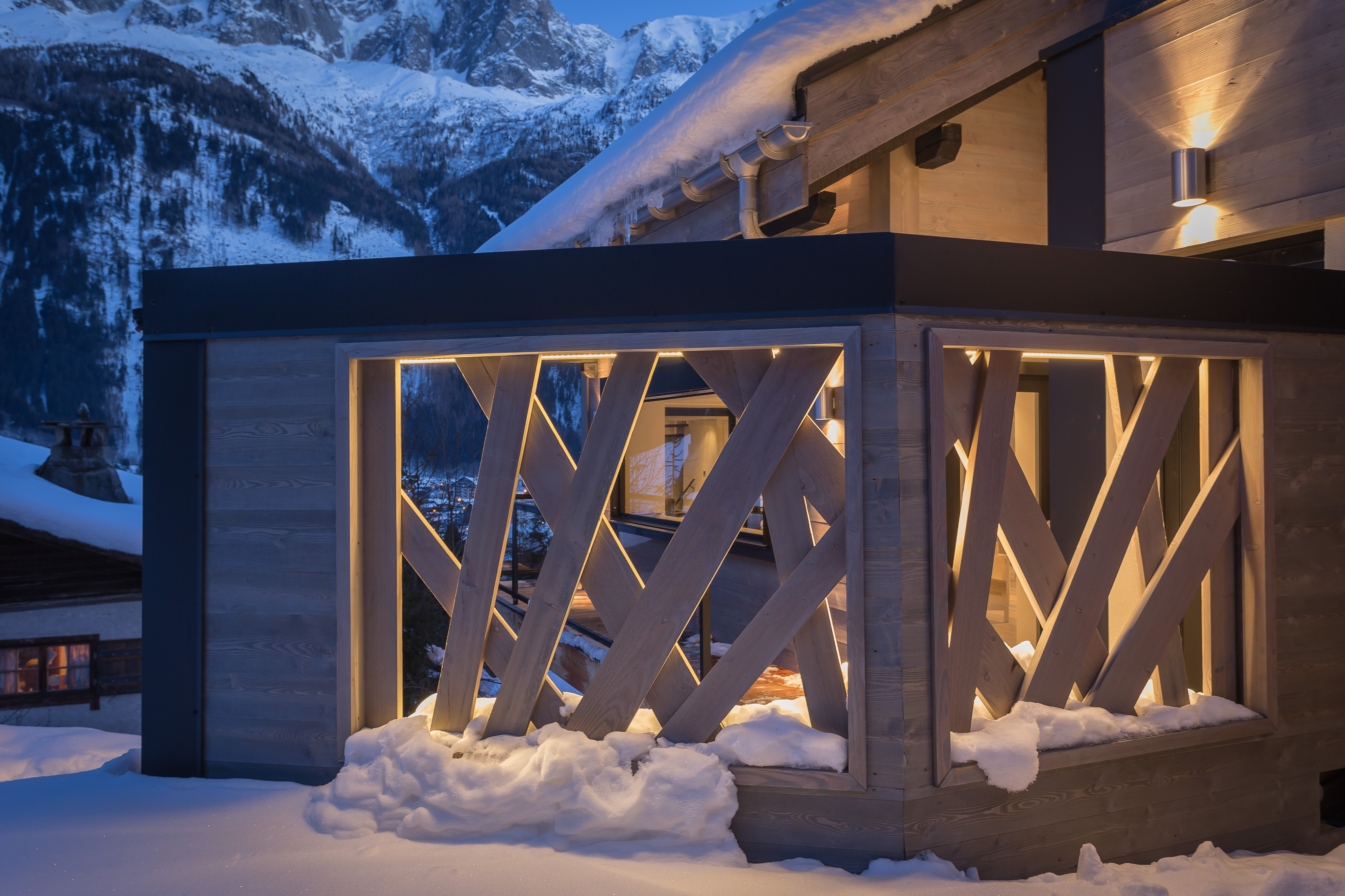 Иногда встречаются варианты, когда ограждение выполнено из стекла. Но такие проекты домов в принципе предполагают максимальное остекление. И назвать их «шале» уже сложно, от альпийской хижины они сохранили только очертания конструкции.