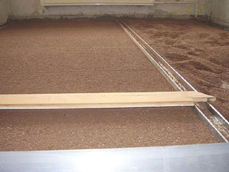 Самый быстрый и наименее трудоемкий вариант. Предполагает засыпку на перекрытие под черновой пол. Материал может быть уложен россыпью по всему помещению, но в этом случае его будет достаточно сложно выровнять. Поэтому вниз устанавливают лаги или маячки и засыпают гранулы.