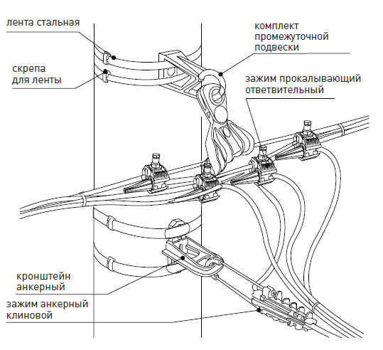 В момент установки прокалывающего зажима и далее в процессе его эксплуатации кабель в местах ответвлений не должен быть в натяг, а должен висеть свободно.