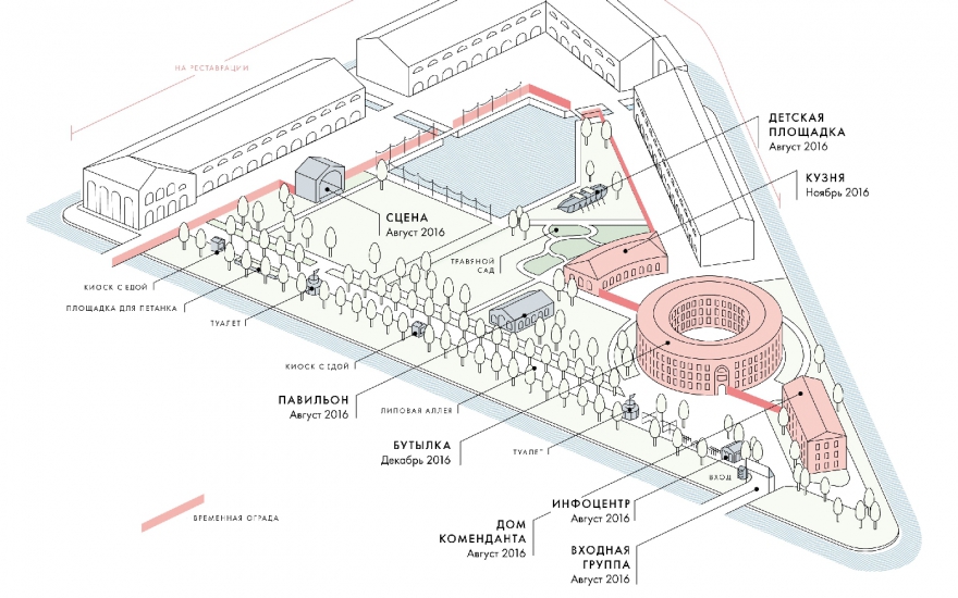 В августе 2016 года стартовала первая фаза проекта. Это включало в себя благоустройство парковых зон с временными павильонами, а также систему инженерных решений и сетей, необходимых для реализации проекта. В 2016 и 2017 годах к этим зданиям присоединились «Литейный», «Бутылочный» и «Комендантский». Впервые за время существования острова территория открыта для посещений круглый год, включая зимний сезон.