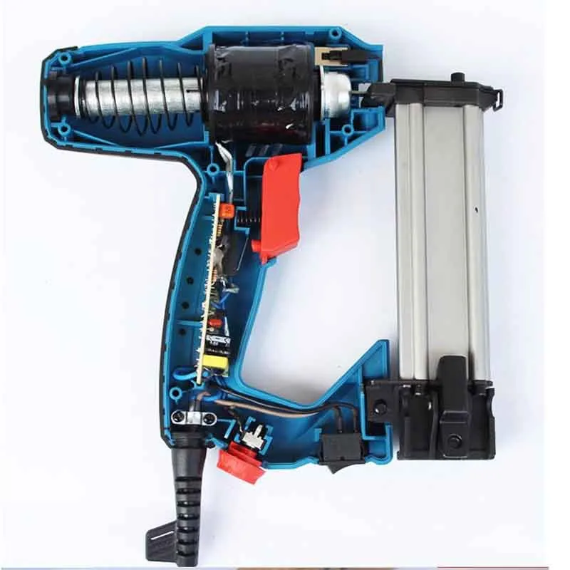 - Электропистолеты. Обычно их используют для забивания шпилек, штифтов и других декоративны элементов. Могут работать как от сети, так и от аккумулятора. Подходит для периодических работ из-за небольшой мощности и низкой скорости работы.