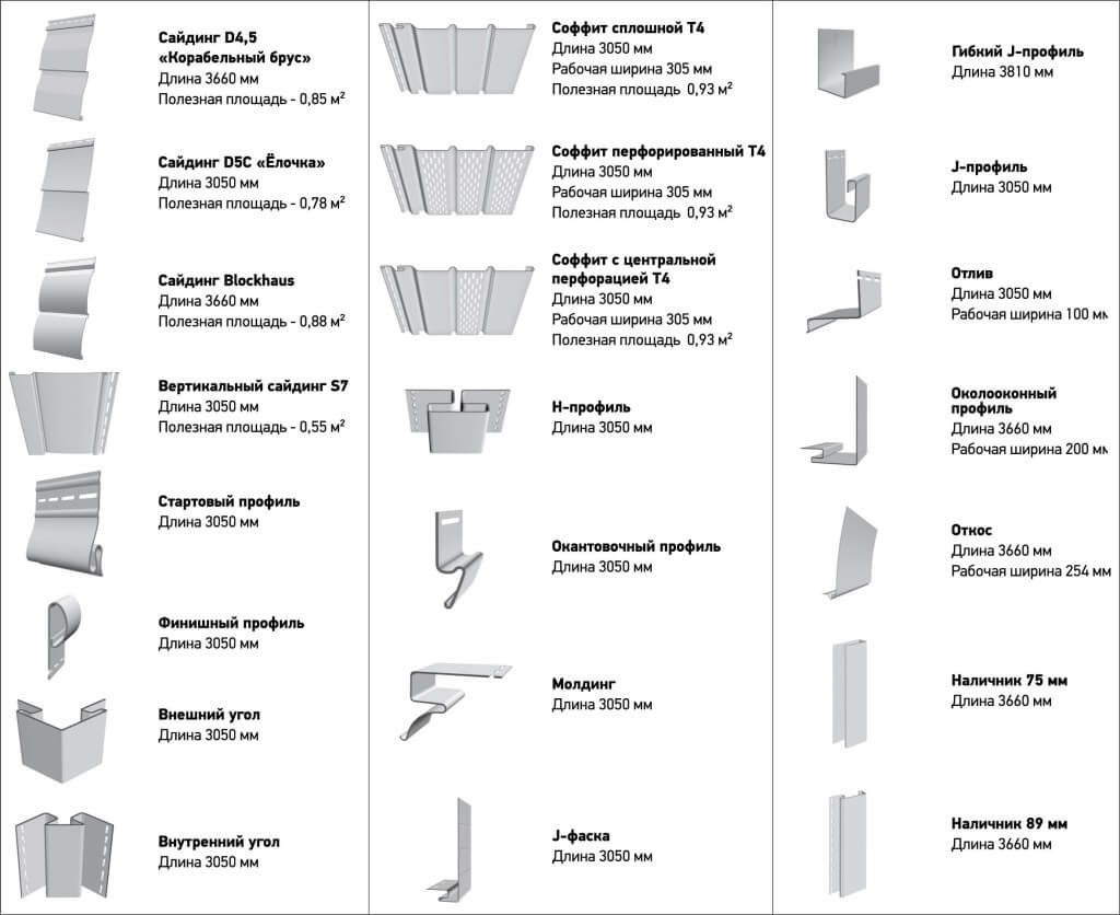 Наружные и внутренние углы имеют длину 3050 мм, ширина соответствует ширине панели. Стартовые и финишные планки выпускаются длиной 3660 мм. Навесные профили и планки для оформления оконных наличников имеют такую же длину, а околооконные откосы – 3050 мм.